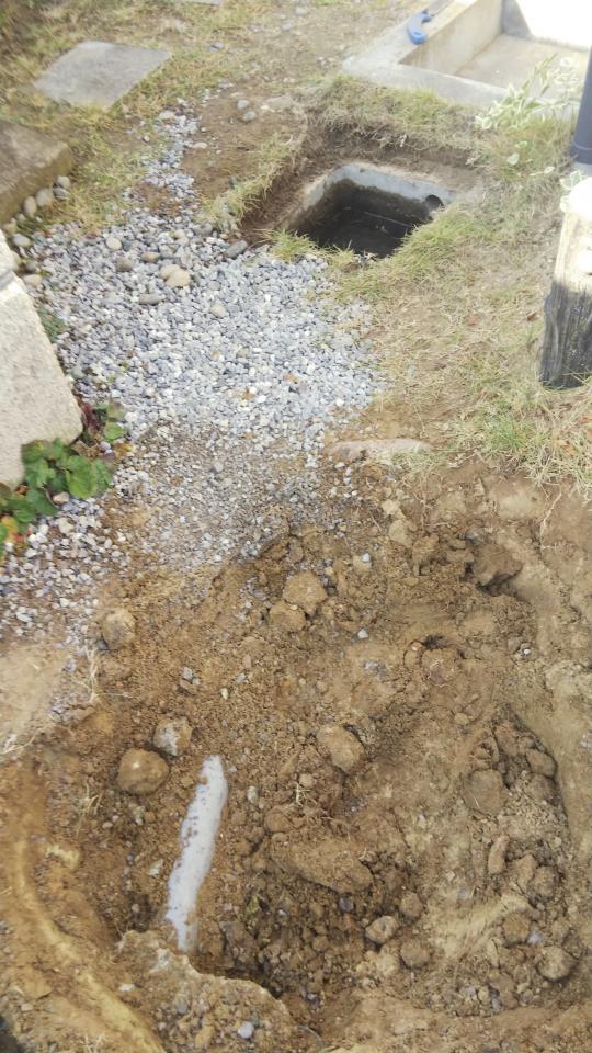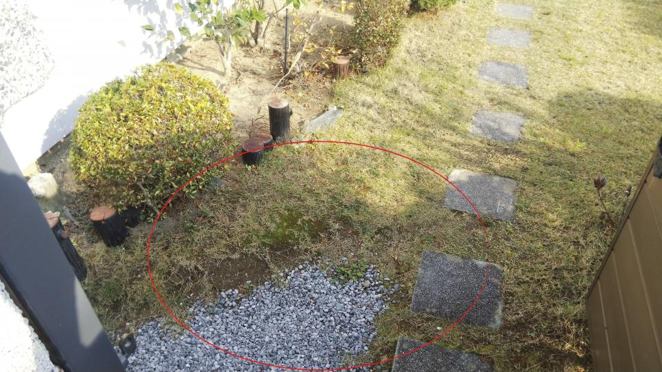 2枚目の写真。赤丸の辺りが怪しいと言う事で、撒き石を避けた後、配管探しの土堀り開始です。